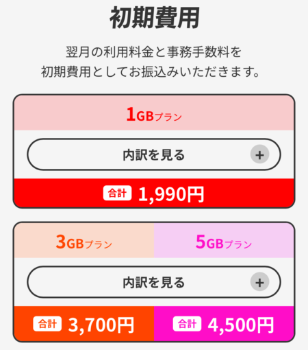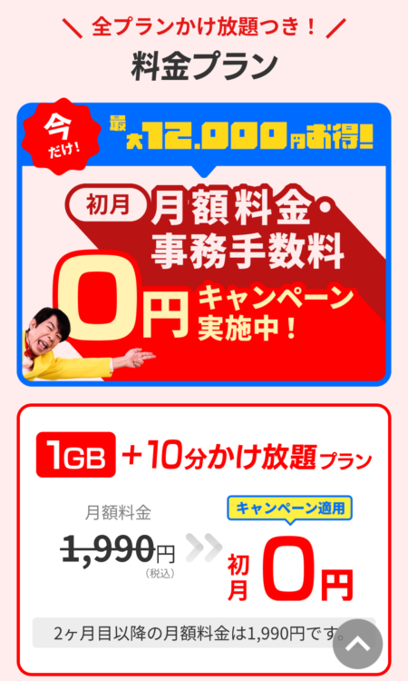 だれでもモバイルでは、プランごとに初月0円キャンペーンが案内されています。特に1GBプランは、2ヶ月目以降は月額1,990円(税込)です。