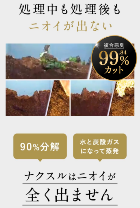 ナクスルは、乾燥とバイオの力を組み合わせた生ごみ処理機で、“ポイっと捨てるだけ”の手軽さや、処理中も処理後もニオイが出にくいこと、さらにお手入れの負担が少ないことが大きな魅力です。